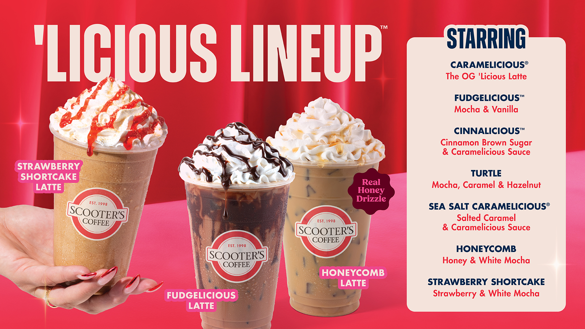 Introducing the ‘Licious Lineup at Scooter’s Coffee! These delicious signature drinks deliver fan-favorite flavors like caramel, cinnamon brown sugar, mocha, vanilla, salted caramel, honey, strawberry, and white mocha! With the introduction of this permanent new lineup, three brand new drinks will make their debut, two limited-time drinks are staying for an encore, and two longstanding crowd favorites are joining the ‘Licious Lineup club. Try these delicious drinks before they launch like a true VIP when you order through the Scooter’s Coffee mobile app with early accessstarting Monday, February 16!