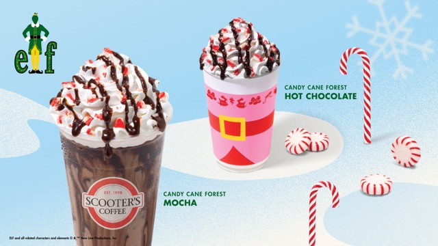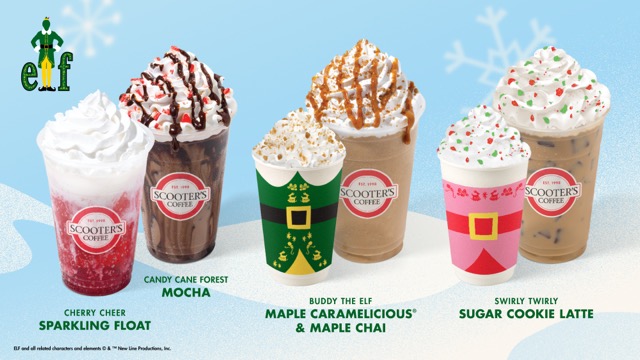 Beginning Saturday, Nov. 1, 2025, Scoot On Around® to Scooter’s Coffee throughout the holiday season for drinks and food items that feature maple, peppermint, and cherry flavors inspired by the holiday classic film. Each drink comes served in a cup featuring designs inspired by Buddy the Elf and Jovie’s North Pole looks and topped with a sticker featuring a friendly face from the North Pole. Many stores will also feature holiday lighting and décor inspired by Buddy the Elf’s journey to New York City to find his father.
