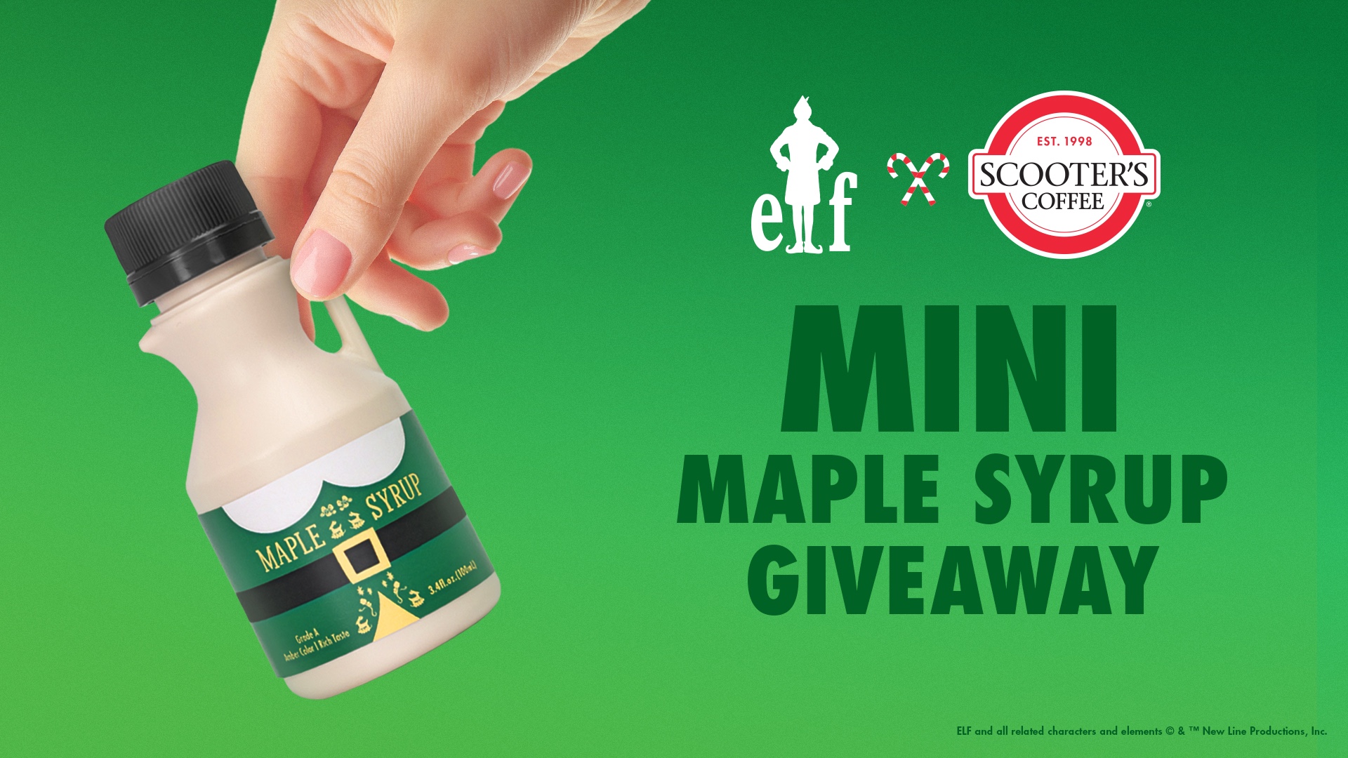 On Thursday, Nov. 6, 2025, be one of the first 50 customers to Scoot On Around® to your local Scooter’s Coffee location after 3 p.m. local time and you’ll score a free mini bottle of delicious maple syrup! Inspired by Buddy the Elf’s love for syrup, this co-branded Elf x Scooter’s Coffee mini bottle of maple syrup is the perfect companion for any of our holiday menu items inspired by Buddy the Elf and his journey to find his father in New York City.