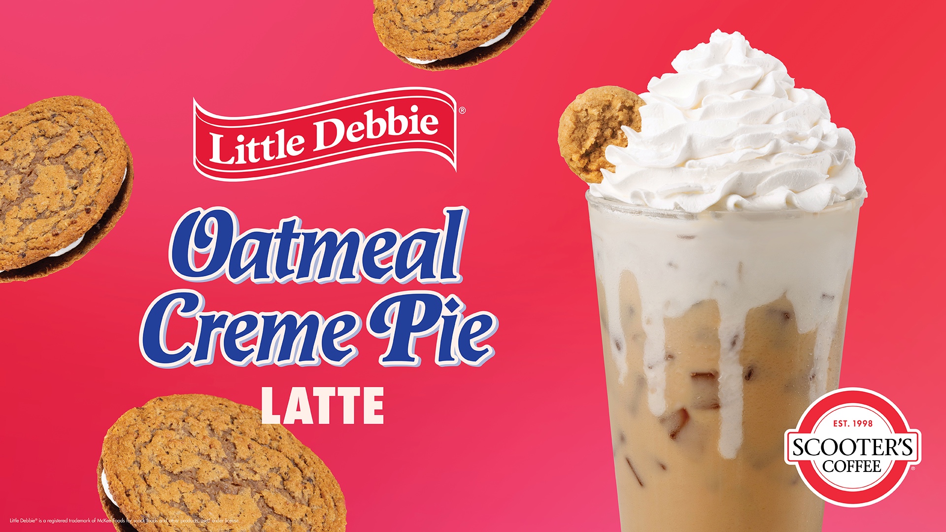 Scooter’s Coffee and Little Debbie are teaming up to create the perfect limited-time sip based on the Oatmeal Creme Pie, the original Little Debbie snack favorite. The Oatmeal Creme Pie Latte features the warm, sweet flavors of oats and molasses inspired by the classic treat paired with our world-class espresso and white mocha sauce. It features a crème drizzle and comes topped with a cloud of whipped cream and a soft mini oatmeal cookie from our bakery. Try all three varieties—hot, iced, or blended—for three irresistible takes on the classic Little Debbie snack!