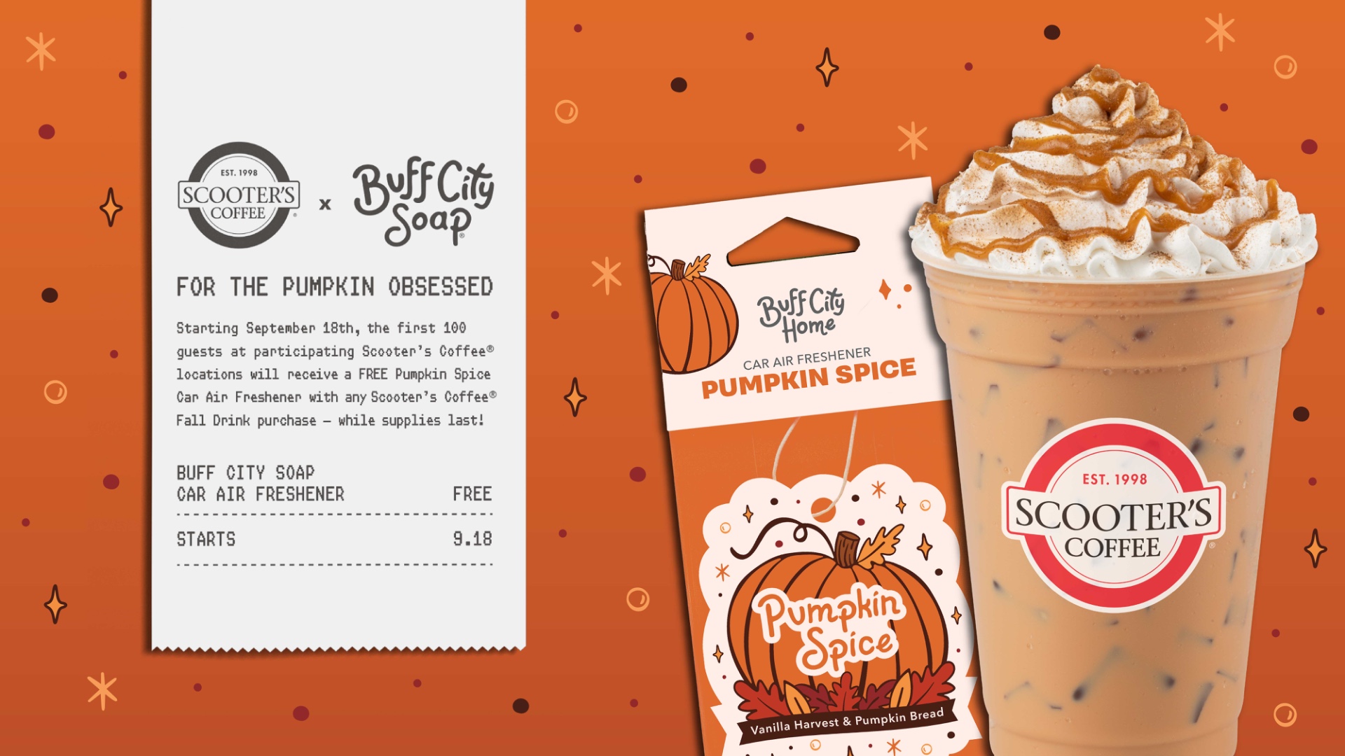 On Thursday, September 18, customers can Scoot On Around® to select Scooter’s Coffee locations to receive a free Buff City Soap Pumpkin Spice Car Air Freshener with purchase of any drink from our fall menu. Sip on a Pumpkin Caramelicious® or Autumn Caramel Swirl while you enjoy the warm and cozy scent of freshly baked pumpkin, sweet maple syrup, and a touch of cinnamon in your car! Supplies are limited, so visit a participating Scooter’s Coffee location early to snag your autumn-inspired Car Air Freshener before they’re gone. Limit one per customer with purchase of a fall menu item while supplies last.