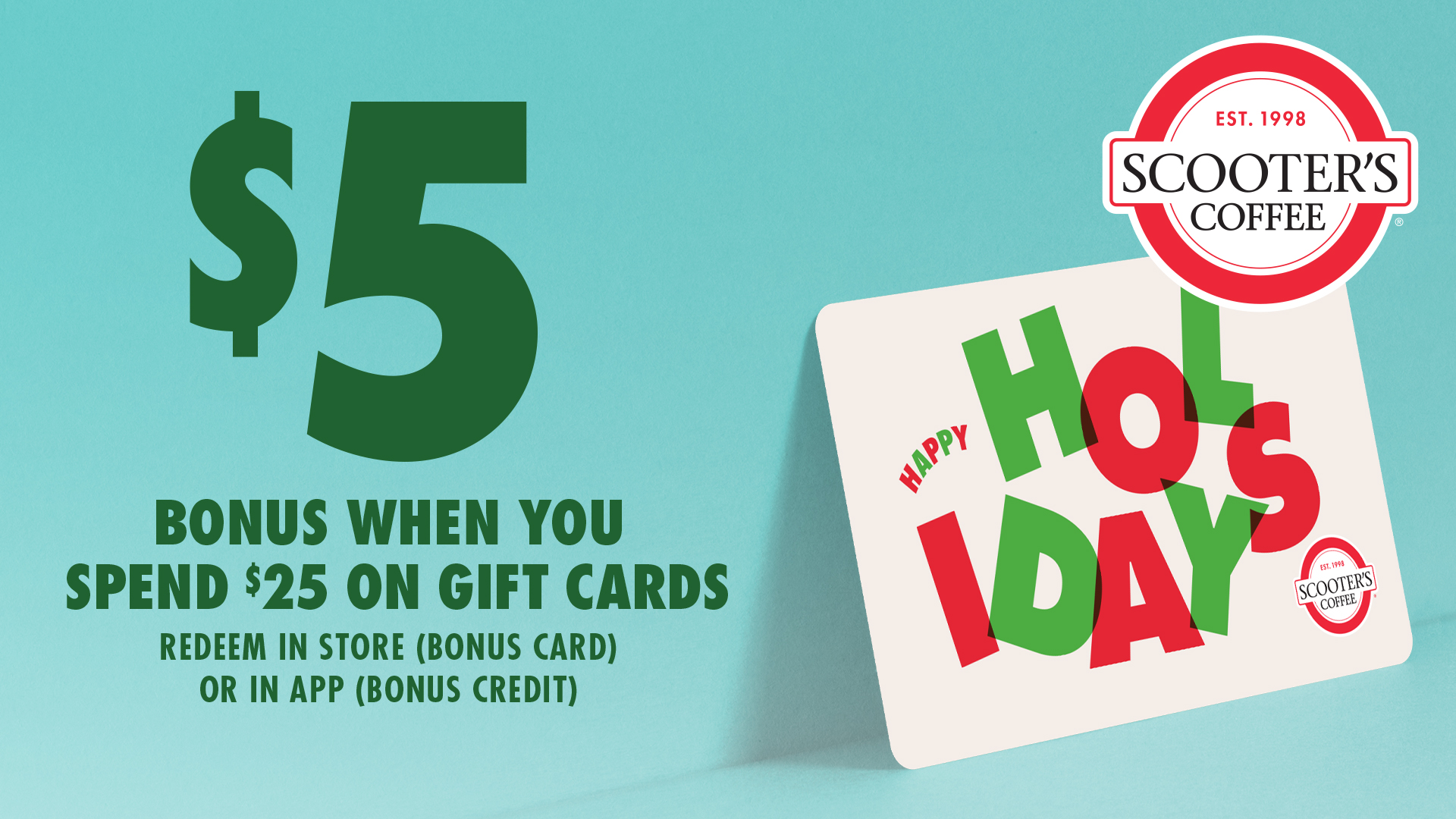 Through this promotion, for every $25 in gift cards purchased, you’ll get a $5 bonus, all for yourself! The more you spend, the more bonuses will stack up. Spend $50, get $10; spend $75, get$15 in bonus cheer! Whether purchased in-store or through the Scooter’s Coffee mobile app, it’s the perfect deal to spread holiday cheer.