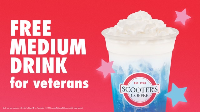 Offer is good for one medium drink at any Scooter’s Coffee location with a valid Military ID. Mobile order ahead is not available for this promotion. Limit one redemption per customer only on Tuesday, Nov. 11, 2025.